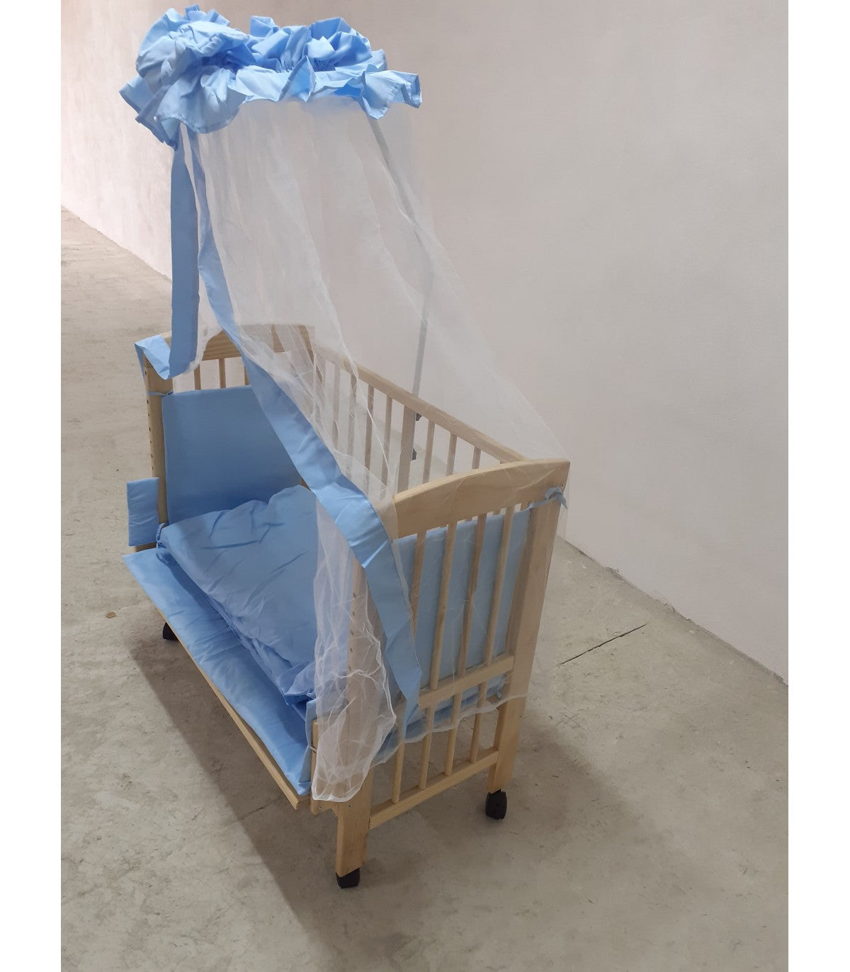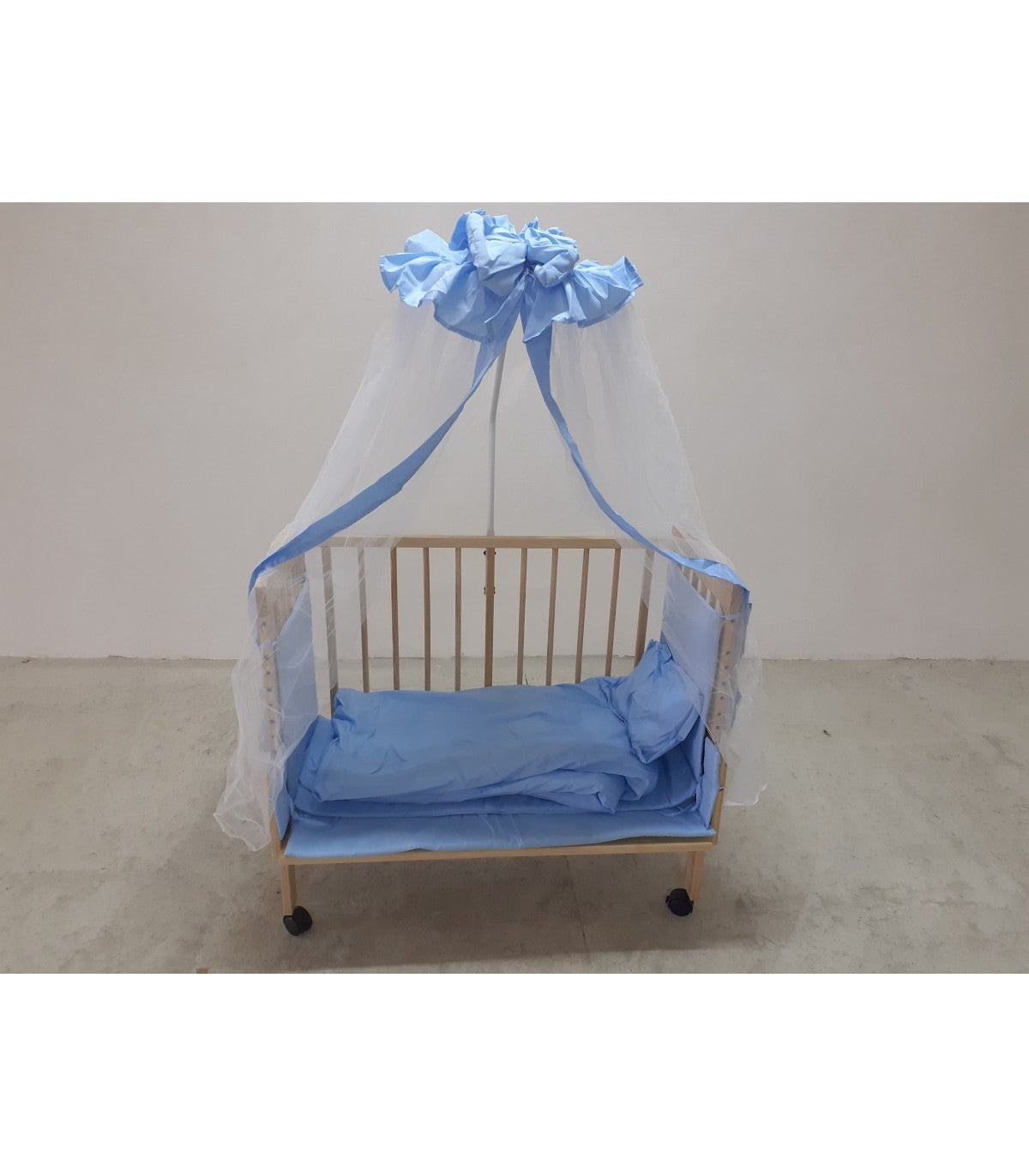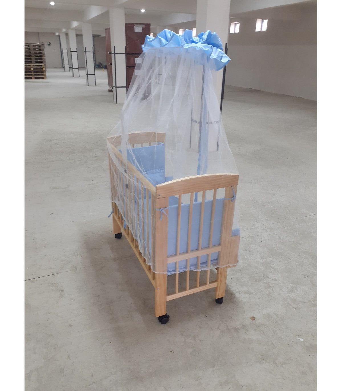 Setul include o saltea, cadru, baldachin, aparatoare de protectie, perna si husa plapumioara