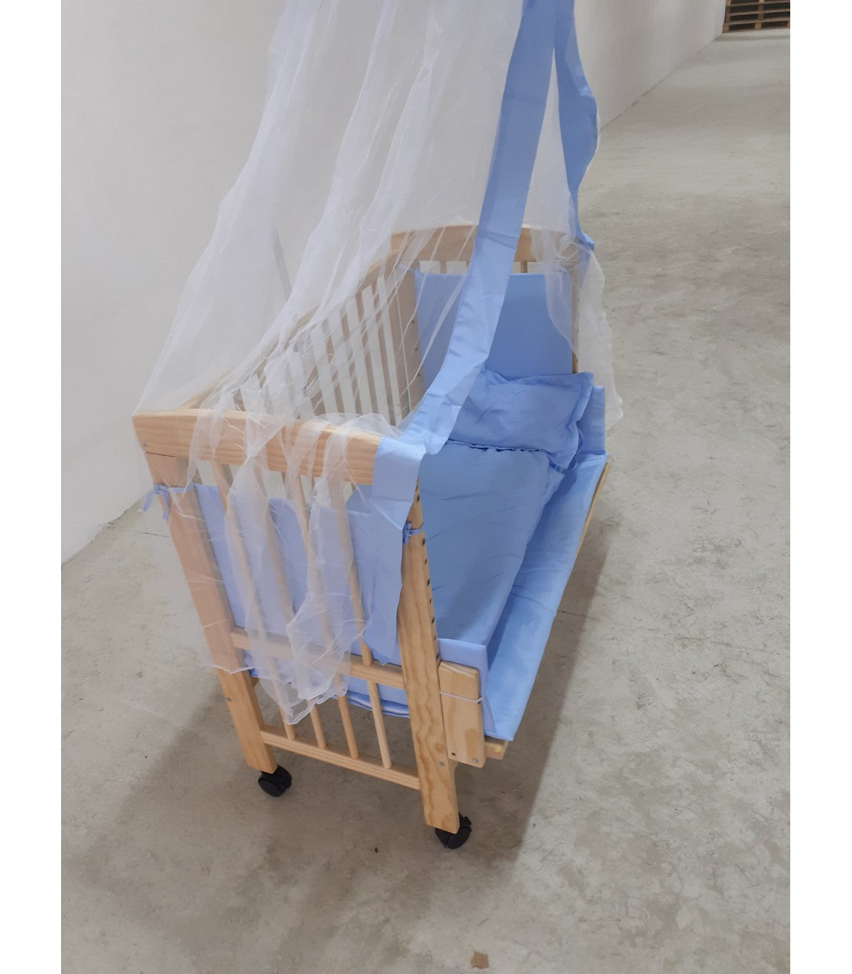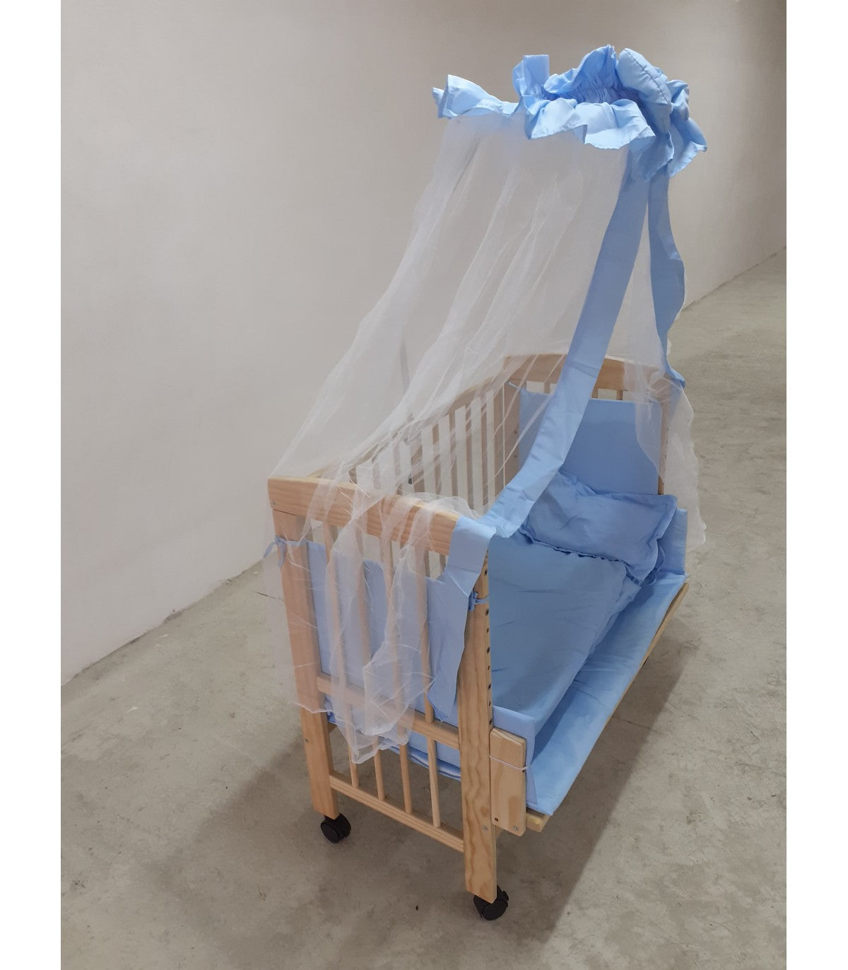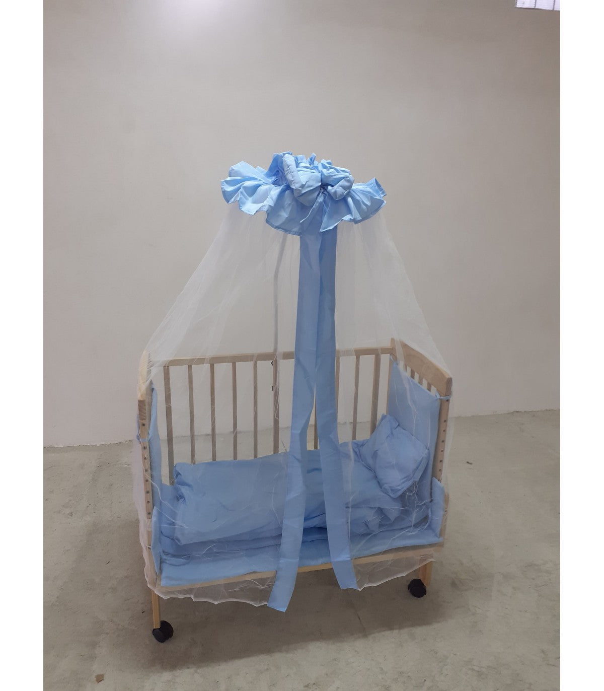 Setul include o saltea, cadru, baldachin, aparatoare de protectie, perna si husa plapumioara